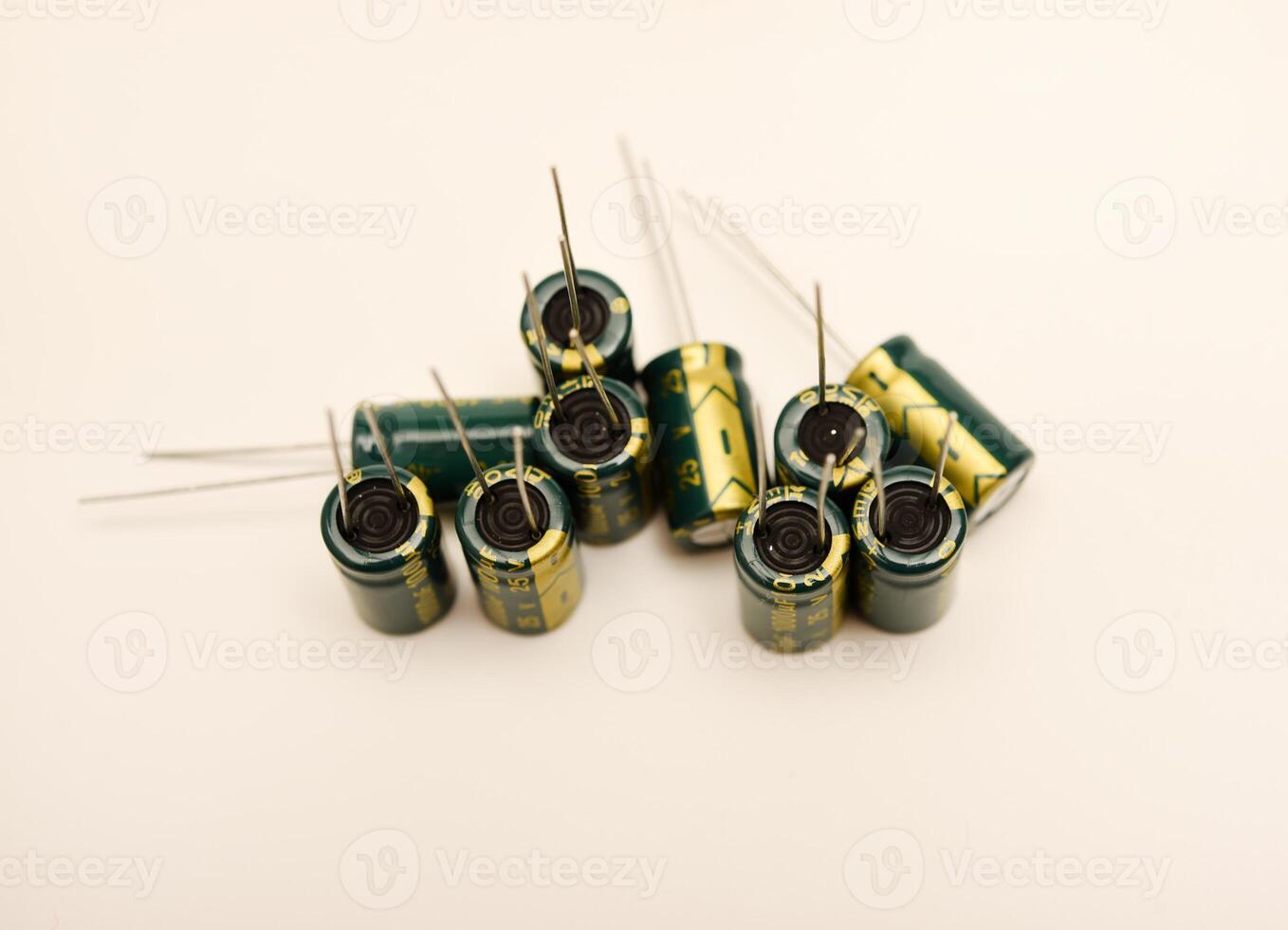 Multiple electrolytic capacitors with different values. Common components in amplifiers, power supplies, and PCBs. Pro Photo