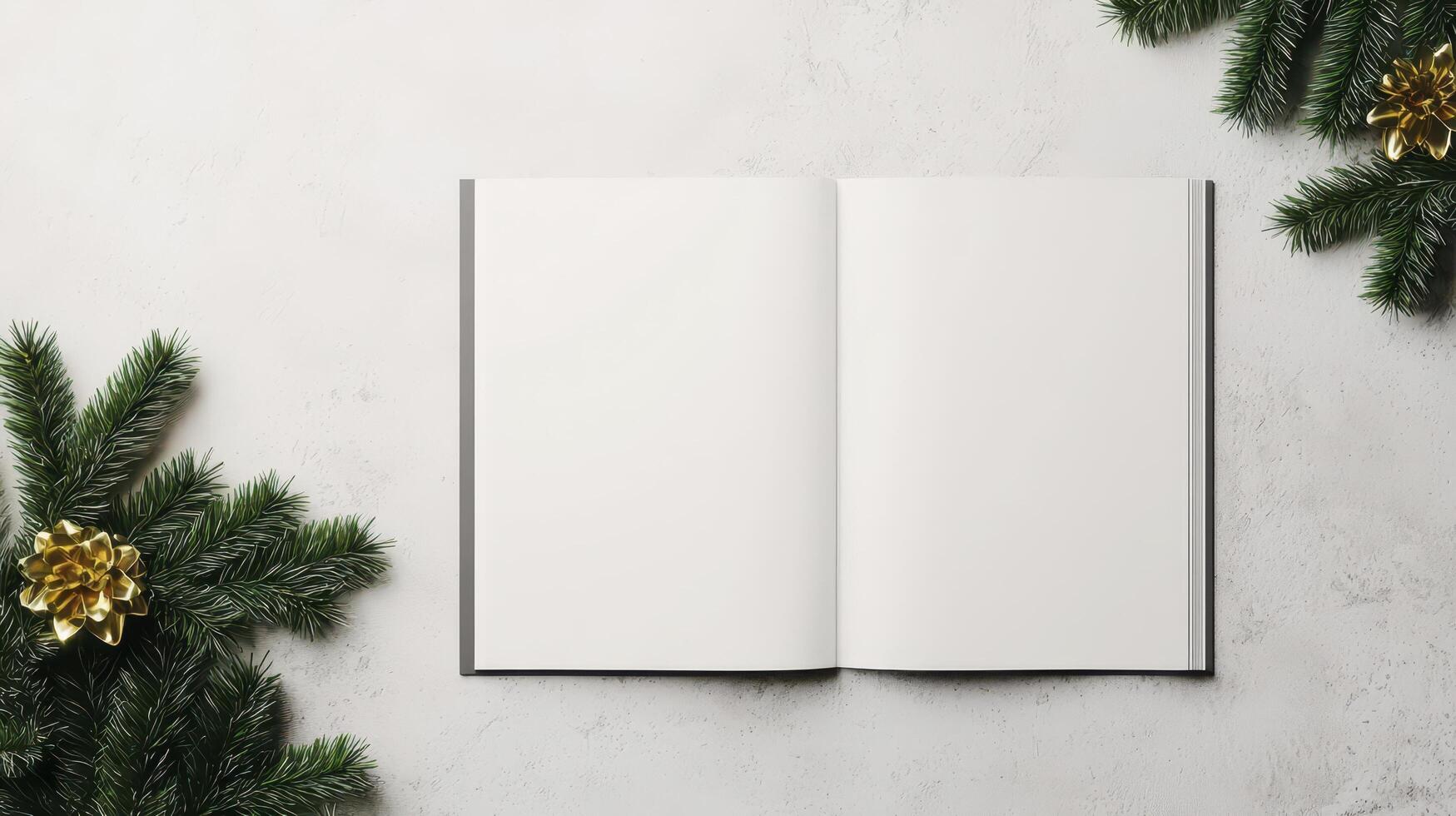 Open blank notebook surrounded by festive greenery on a textured surface. photo
