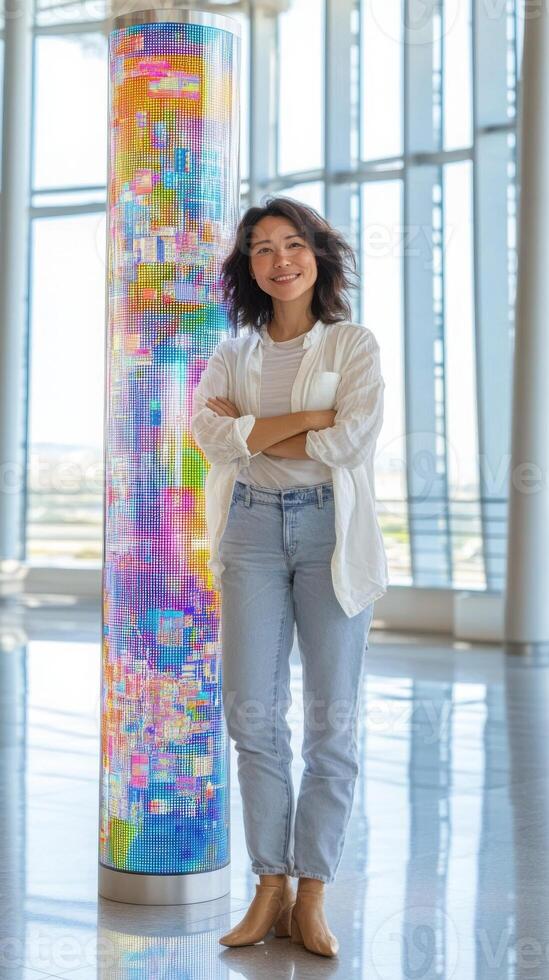 Confident female data analyst standing in front of futuristic dashboard in high-tech office environment. Data scientist Pro Photo