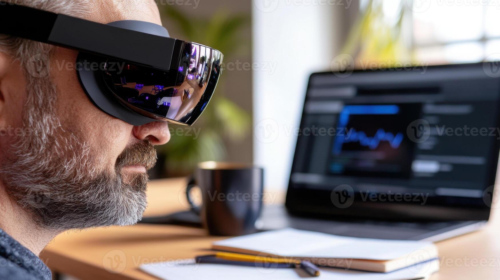 Man engaged in a virtual machine learning course with focus on laptop screen, Jupyter notebook in view, headset on, and clean workspace. Data scientist Pro Photo
