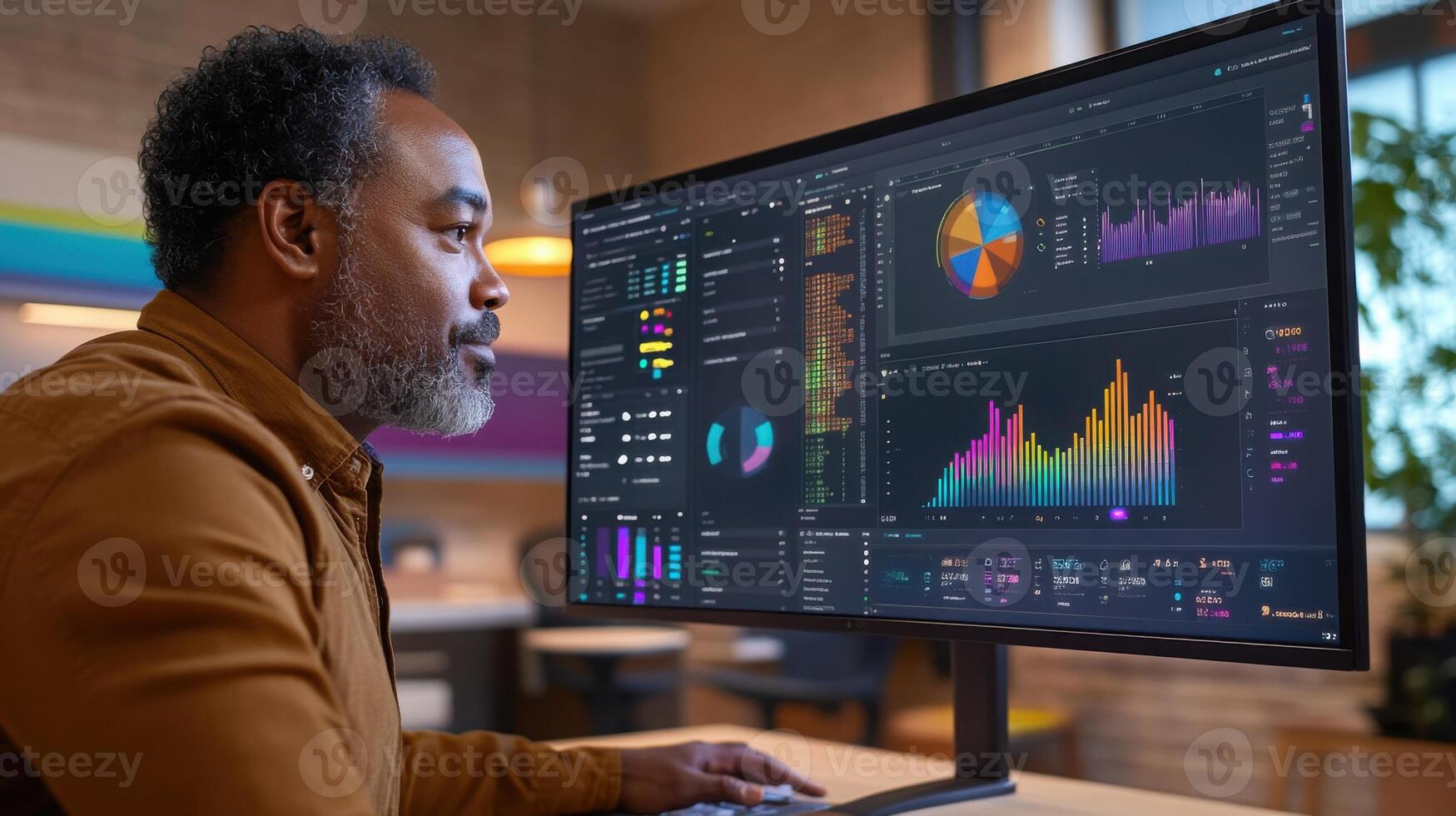 Man in a modern workspace with a large monitor displaying data-driven SaaS UI with real-time visualizations. Data scientist Pro Photo