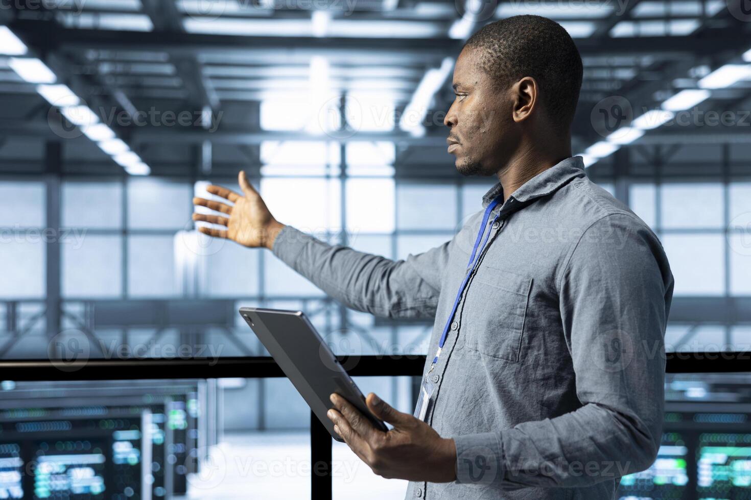 Technician in data center using tablet, developing disaster recovery plans, verifying backup integrity, testing failover scenarios, ensuring data accessibility during disruptions Pro Photo