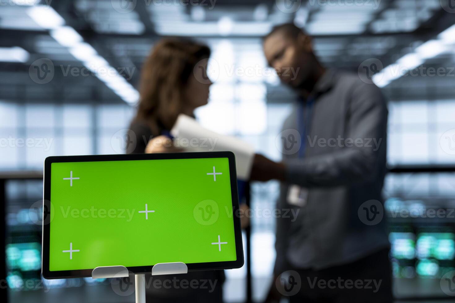 Focus on isolated screen tablet in data center with engineers in blurry background employing machine learning models. Close up of mockup device used by teamworking server hub IT experts Pro Photo