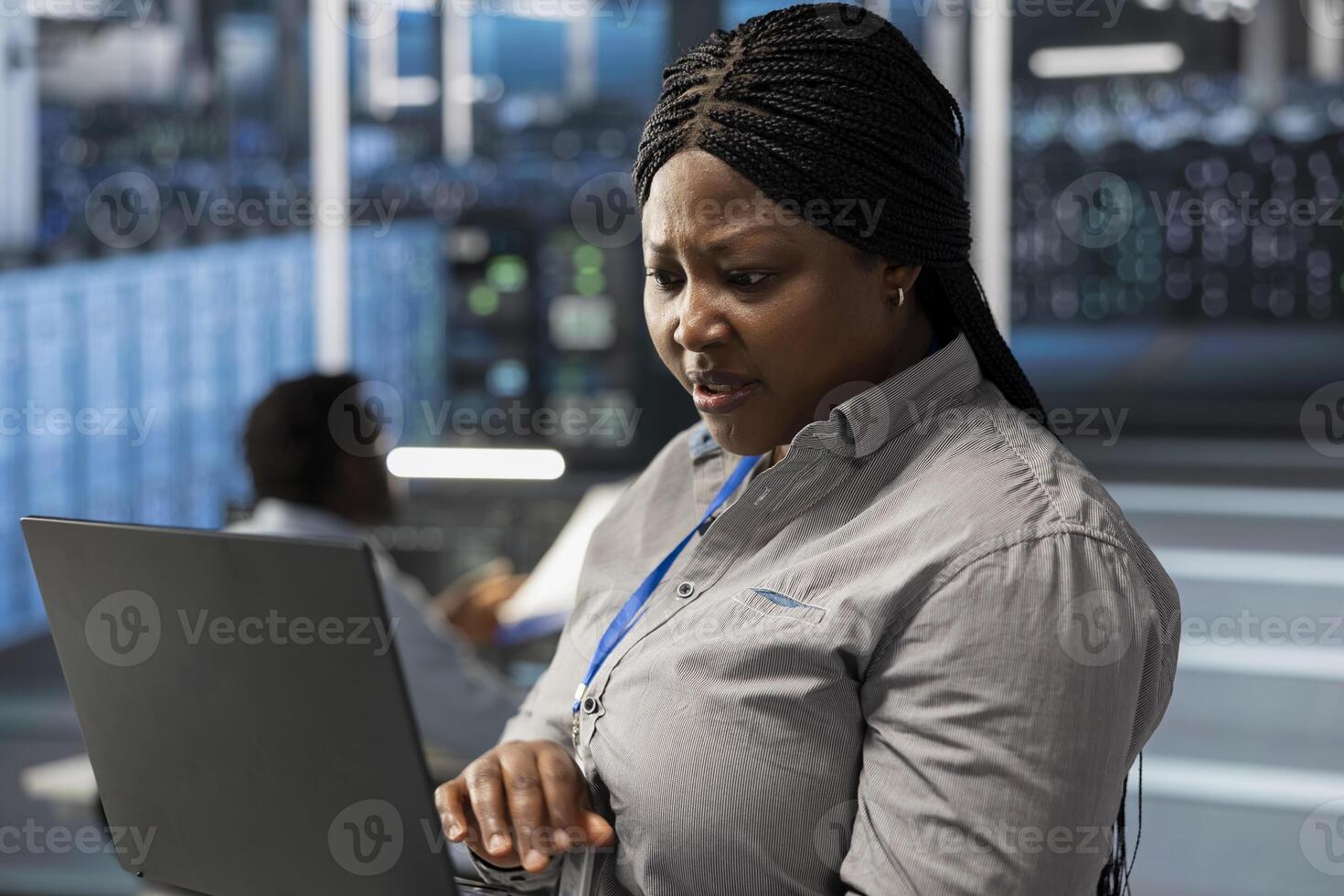 System administrator in server room using laptop to implement and manage data backup solutions. Data center IT expert identifying and resolving technical errors, ensuring efficient recovery Pro Photo