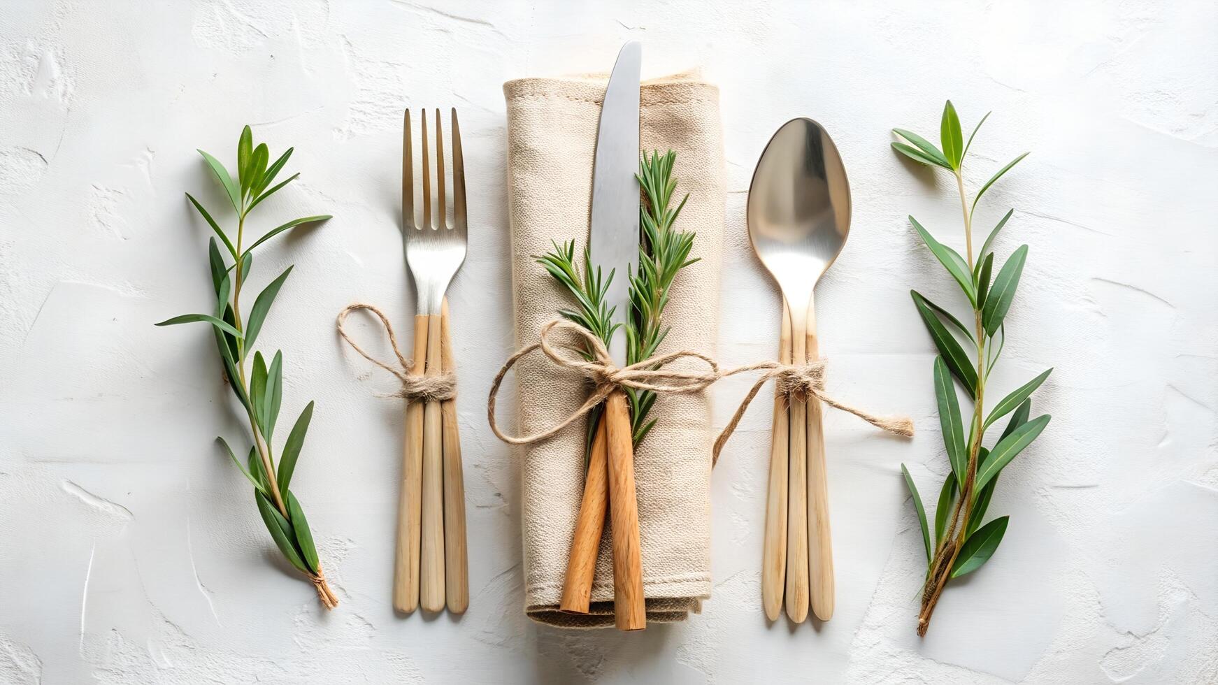 Of elegant table setting with fork, knife, spoon, and rosemary on a rustic napkin, decorated with cinnamon sticks and twine, isolated on white background Free Photo