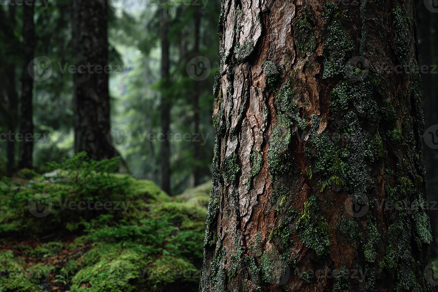 Close up of pine tree trunk with textured bark and moss captured in detailed realistic view Pro Photo