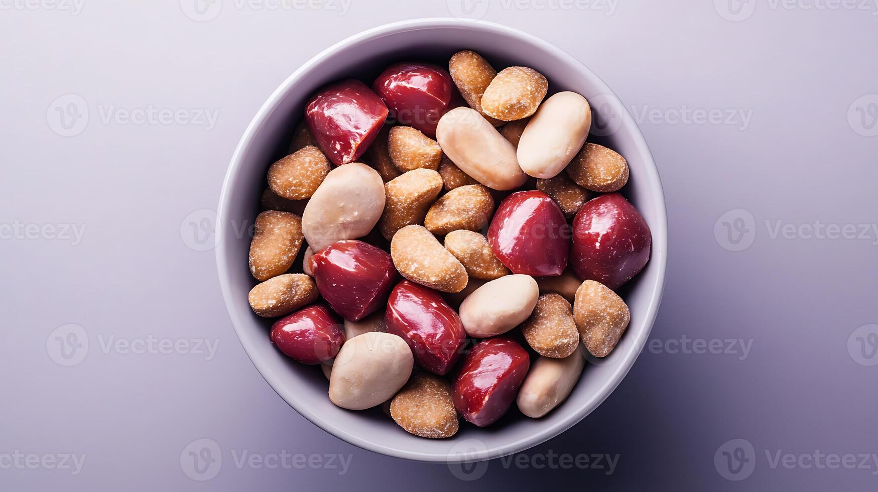 A colorful bowl filled with various nuts and beans on a soft gradient background Pro Photo
