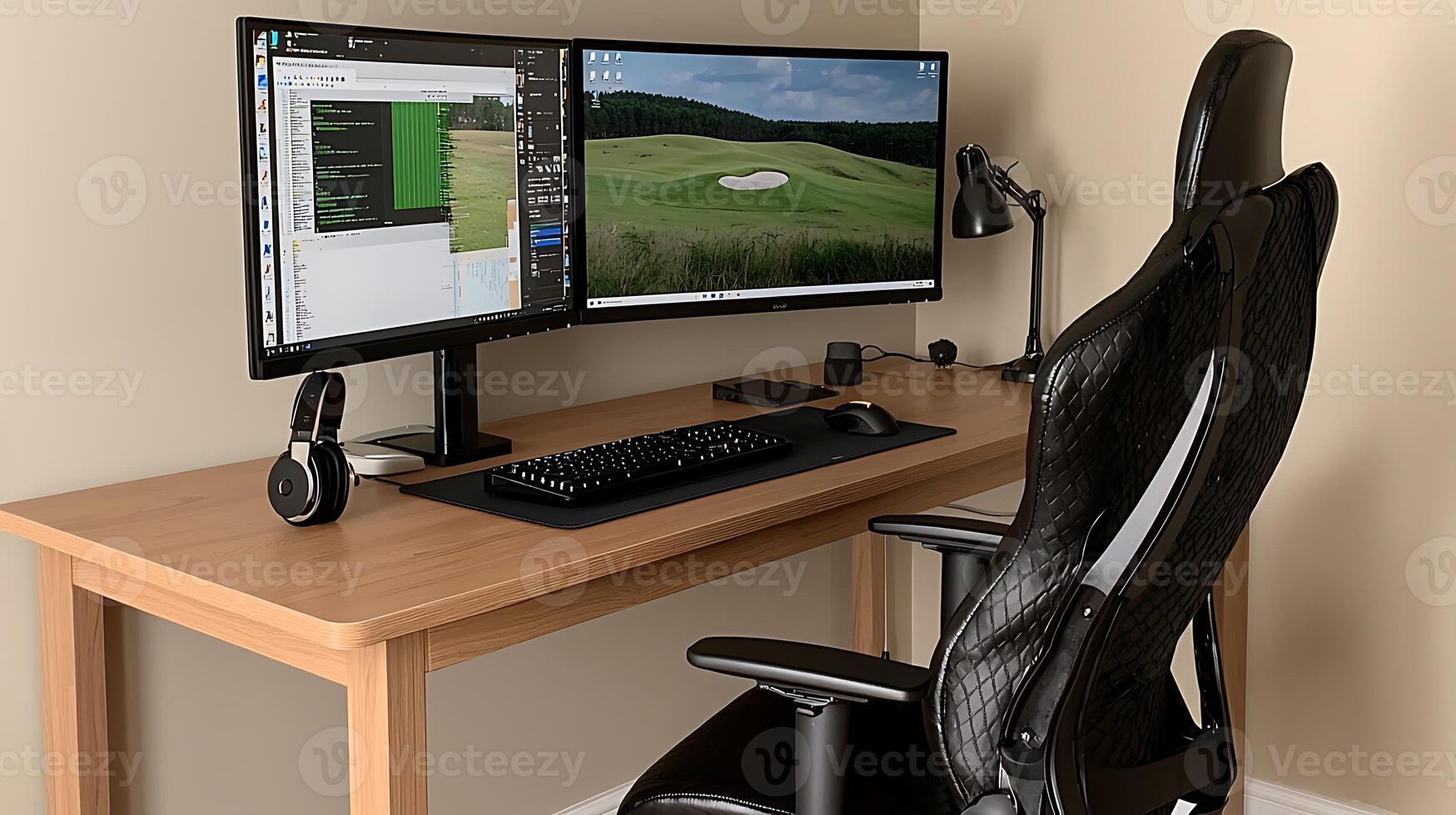 Modern home office setup featuring dual monitors displaying a golf course and coding interface Pro Photo