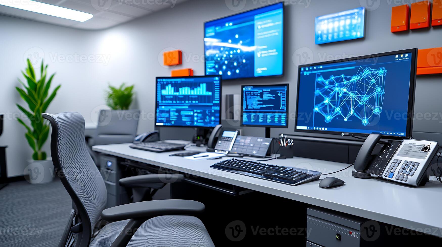 Modern office workspace featuring multiple screens displaying data analytics and graphs Pro Photo