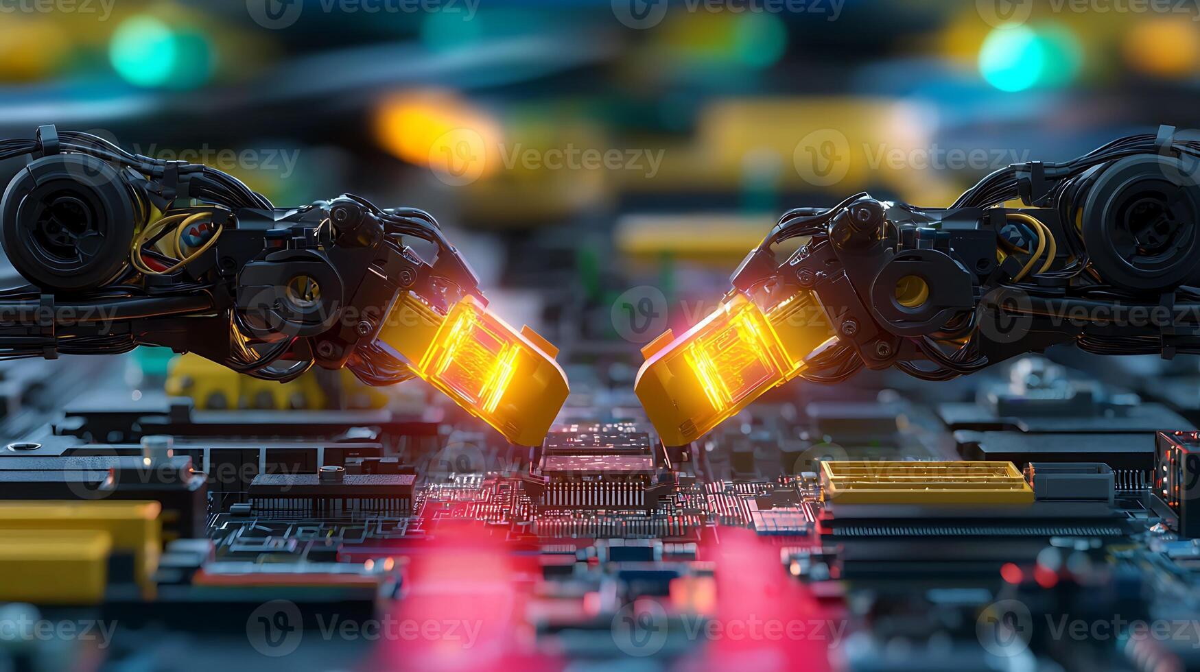 Robotic arms assembling a circuit board with glowing lights in a high-tech environment Pro Photo