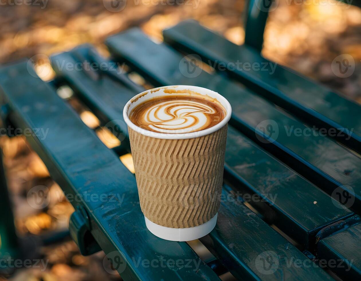 Latte in a takeaway cup on a bench with a swirly pattern Pro Photo