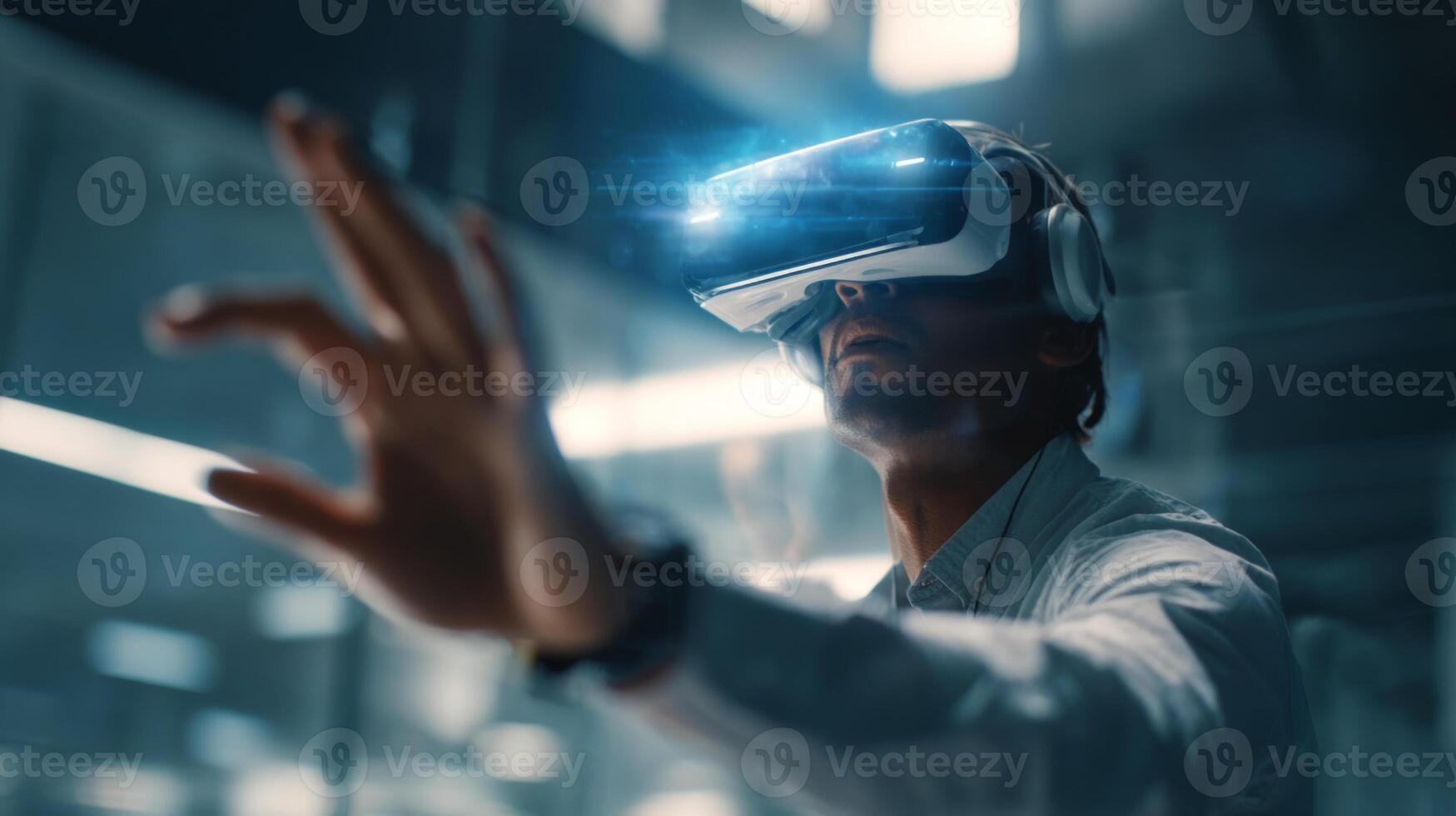 Man Engaged in Virtual Reality Experience with Advanced Headset in a Futuristic High-Tech Environment Pro Photo