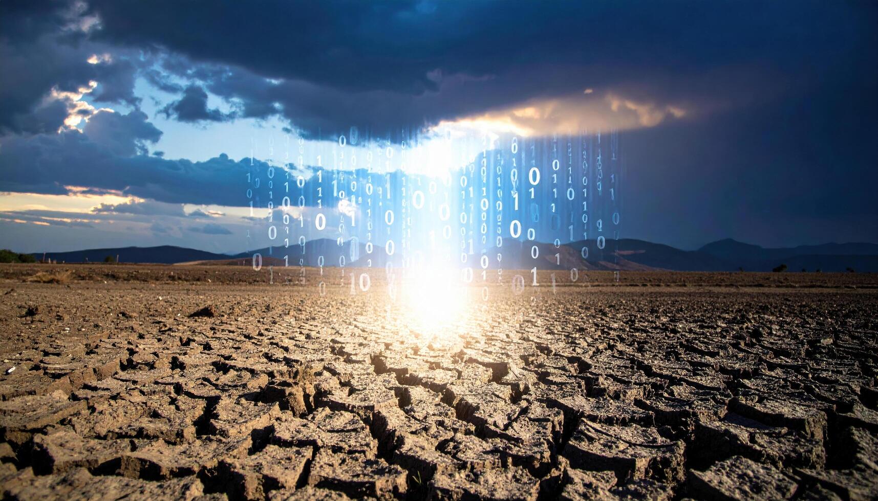 Mysterious glowing beam of digital binary code shines from cloudy sky onto cracked desert landscape. This futuristic concept represents data, information, and technology photo