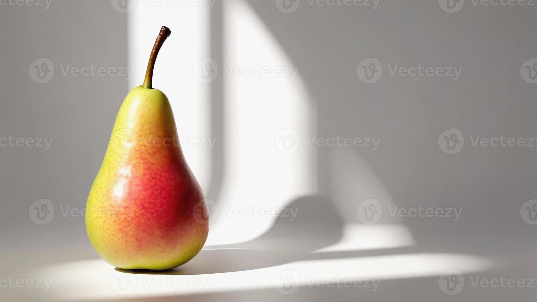 Juicy pear with green and red halves on a light background. Shadows and light stripes create an interesting visual effect. Ideal for culinary and fitness projects. Pro Photo