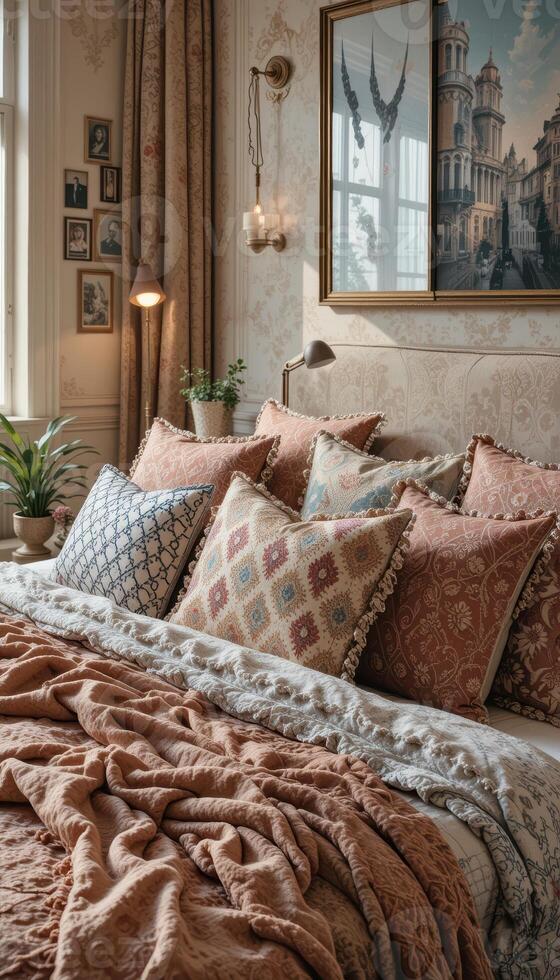 A luxurious and cozy bedroom with an array of patterned pillows on the bed Pro Photo