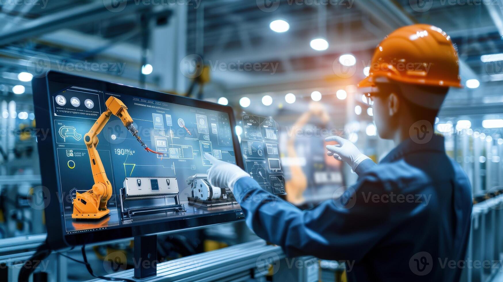 A man is pointing at a robot on computer screen. The robot is orange and has two screens. The man is wearing a hard hat Pro Photo