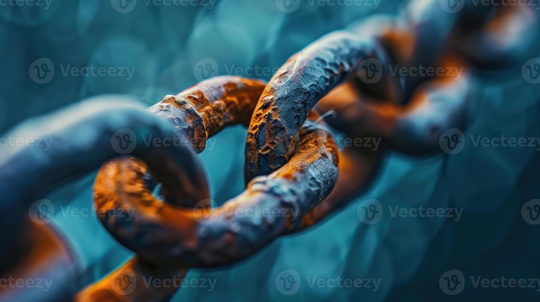 A chain link is shown in a blurry image. The chain is twisted and bent, and the links are rusty. The image has a moody and somewhat ominous feel, as if it is a symbol of something broken or damaged Pro Photo