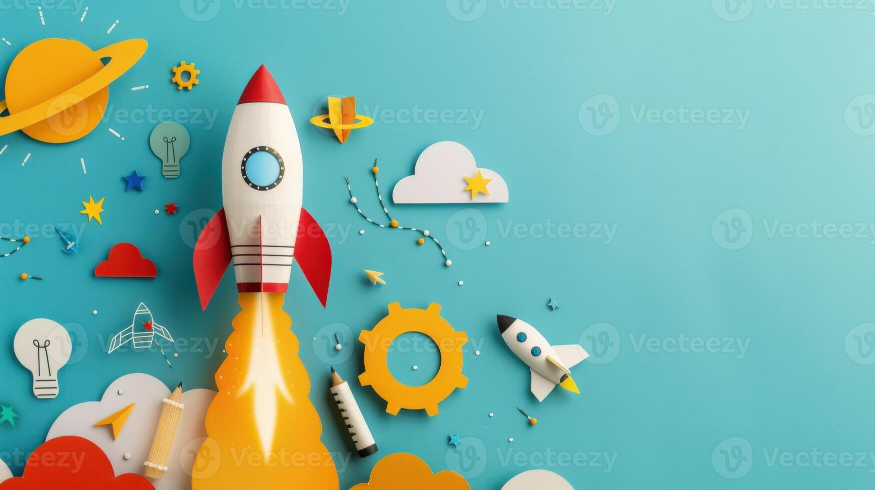 colorful paper rocket is flying through the sky with a blue background. The rocket is surrounded by various other paper objects, including a pencil, a book, and a clock Pro Photo