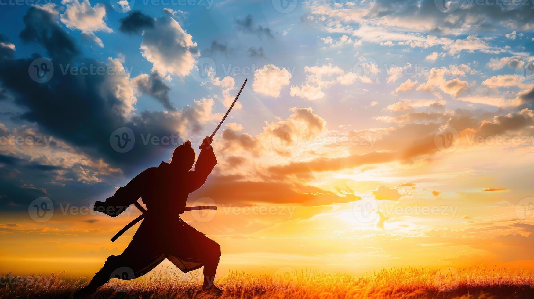 A man in a samurai costume is holding a sword and standing in a field. The sky is filled with clouds, and the sun is setting, creating a moody atmosphere Pro Photo