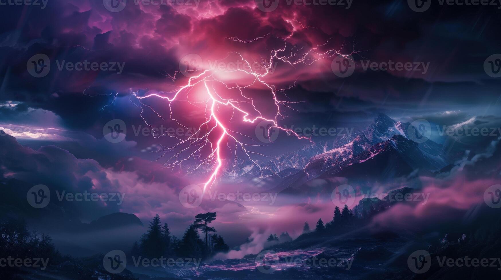 A stormy sky with a bright lightning bolt in the middle. The sky is dark and the lightning bolt is the only source of light. Scene is intense and dramatic Pro Photo
