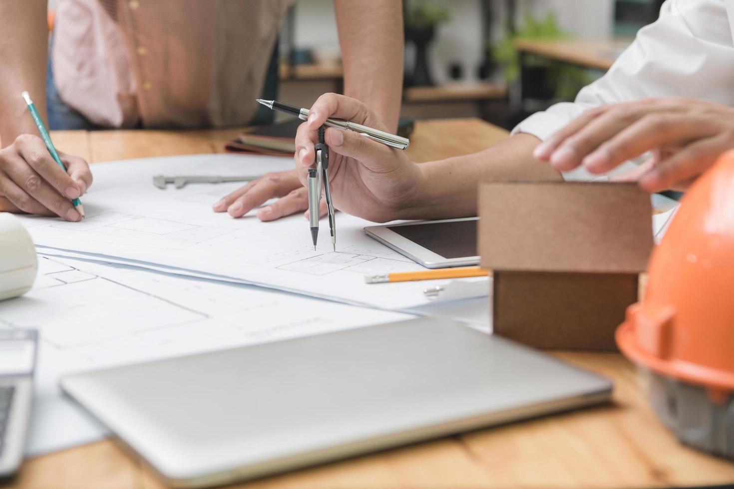 Team of architects or engineer discussing on desk with blueprint about new startup project on desk. Team group on construciton site check documents and business workflow.Selective focus. Free Photo