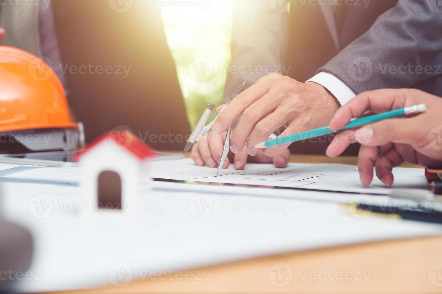 Team of architects or engineer discussing on desk with blueprint about new startup project on desk. Team group on construciton site check documents and business workflow.Selective focus. Pro Photo
