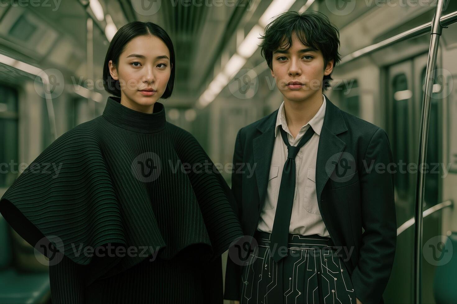 Retro Futuristic Subway Fashion Scene Featuring Two Individuals in Stylish Outfits with Unique Textures and Patterns, Capturing Modern Urban Vibes, Confidence, and Unique Style Elements Pro Photo