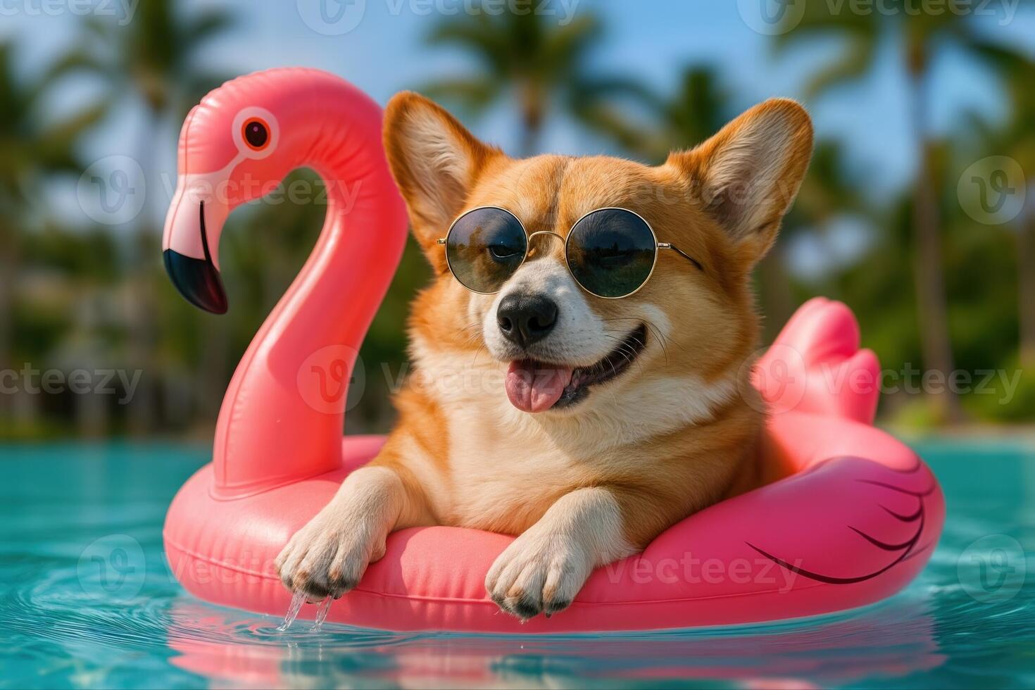 Corgi Relaxing in Pool on Flamingo Float with Sunglasses Under Palm Trees on Sunny Day Pro Photo
