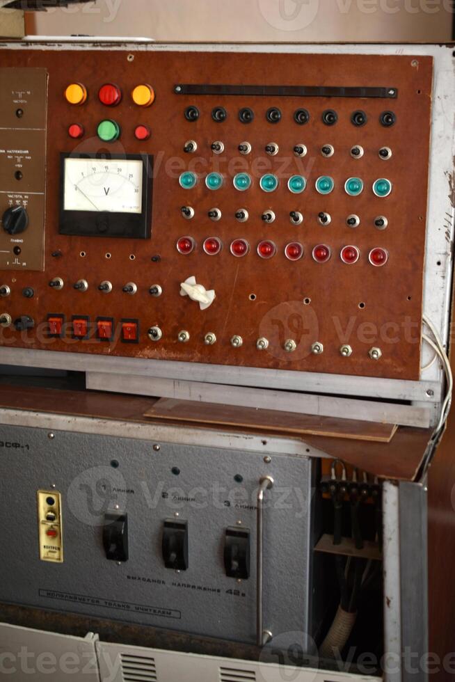 Industrial display board with analog meters and switching levers. A fragment of historic control technology. Pro Photo