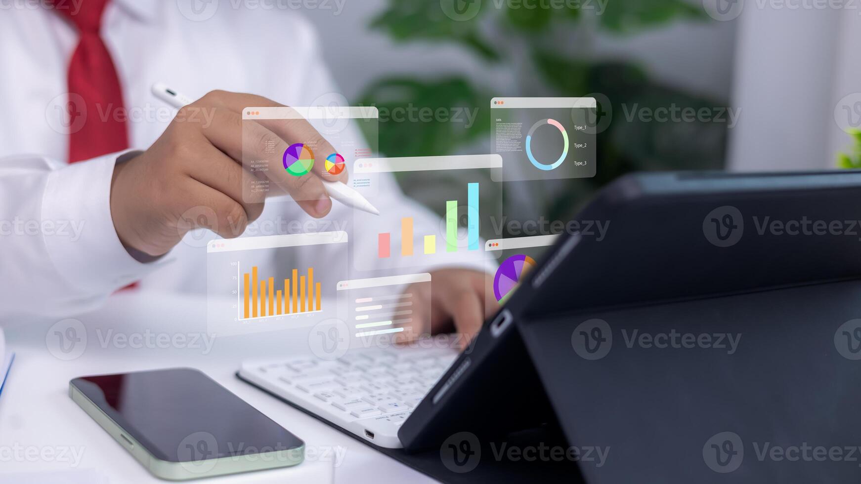 Analytics dashboards and floating holographic charts displayed as a person uses a stylus on a tablet. Concept of modern business analysis, financial planning, and data-driven technology Pro Photo