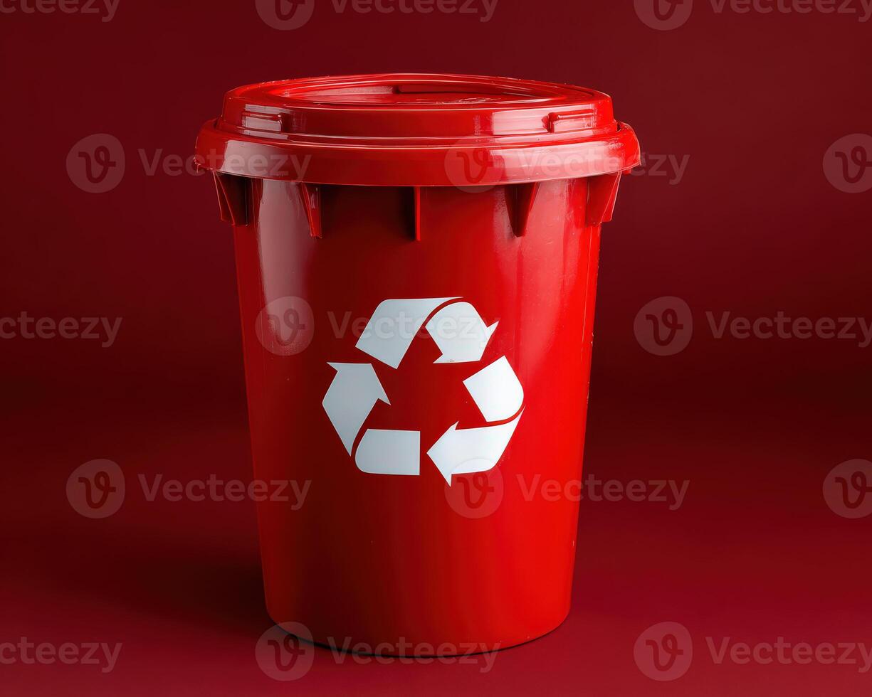 Red recycling bin with lid on red background, symbol for environmental care and waste management, bright plastic container for sorting recyclable materials Pro Photo