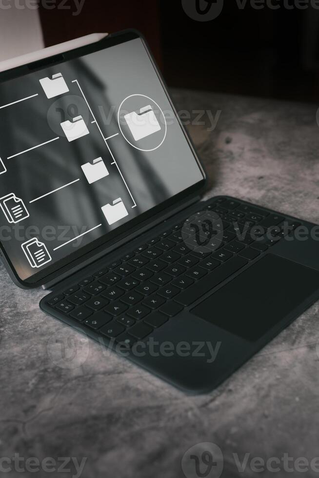 Data transfer on digital tablet. Transfer file of data between folders displaying on screen. Backup data, exchange files and DMS, Document Management System. Virtual document loading to another folder Pro Photo