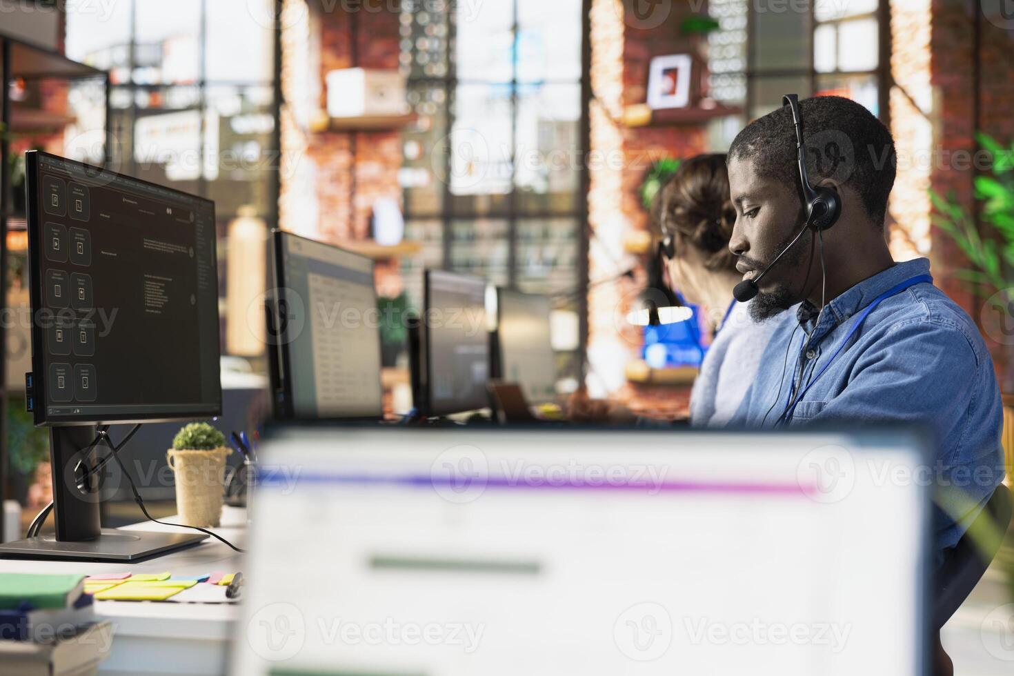 Call center agent using AI chatbot to provide multilingual support to customers. Customer support workplace employee leveraging AI to translate clients interactions in real time Pro Photo
