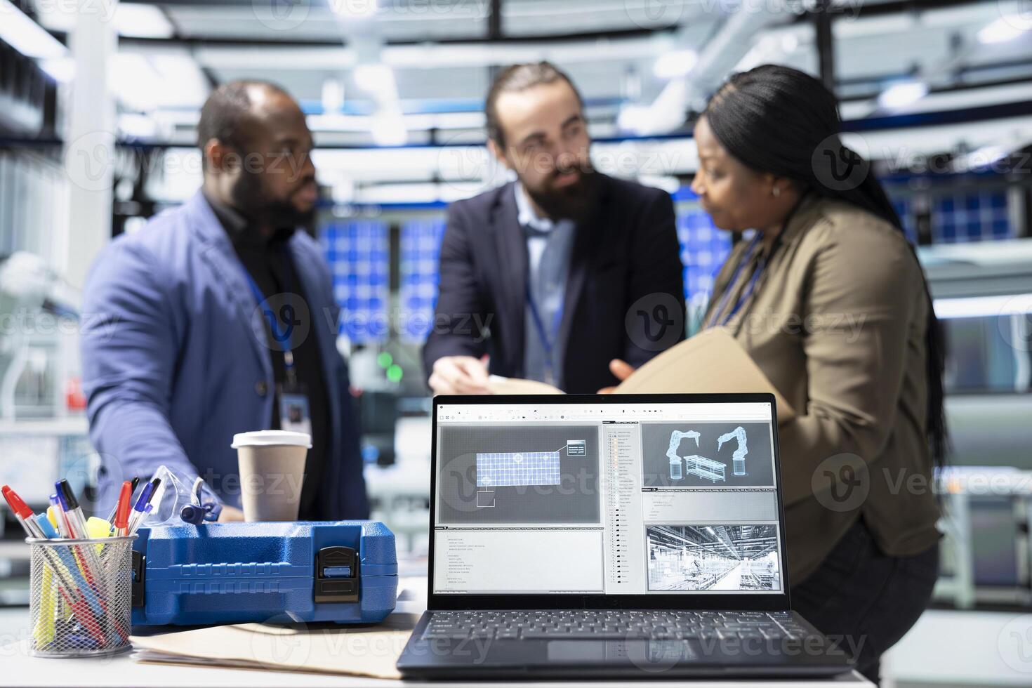 Multiethnic business associates gather in a solar power facility to troubleshoot production challenges, combining engineering expertise with collaborative problem solving. Photovoltaics. Pro Photo