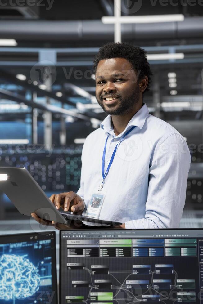 Portrait of smiling engineer in data center using artificial intelligence computerized model. Happy server room IT professional working with AI machine learning algorithms Pro Photo