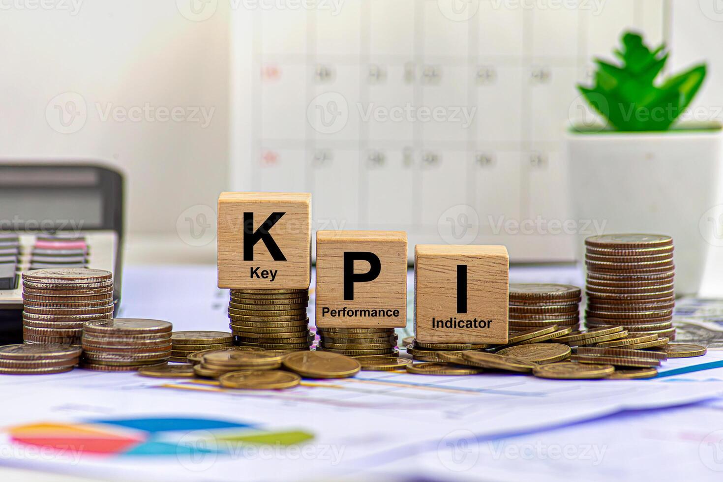 KPI concept. Wooden blocks with KPI icons,copy space. Key Performance Indicator using business intelligence metrics connected to database. Business, finance, operations, sales, marketing performance1 Pro Photo
