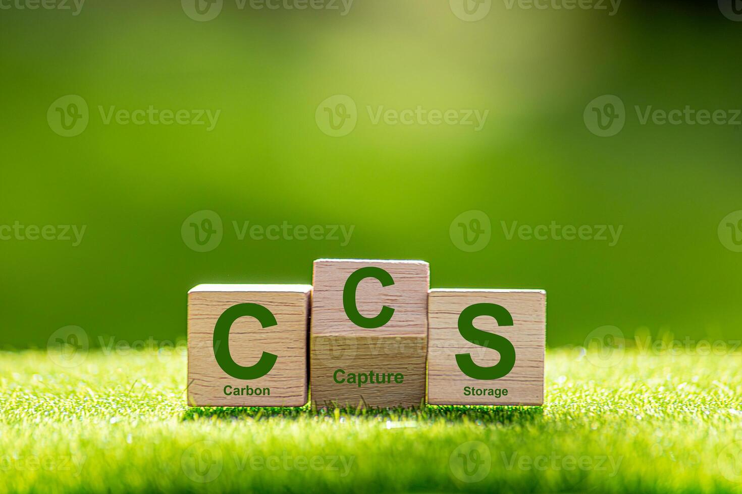 Symbol CCS for Carbon Capture Storage words CCS on a wood cube on the environmental background. Net zero action concept. green energy, reduce carbon footprint, Save energy carbon dioxide. Pro Photo