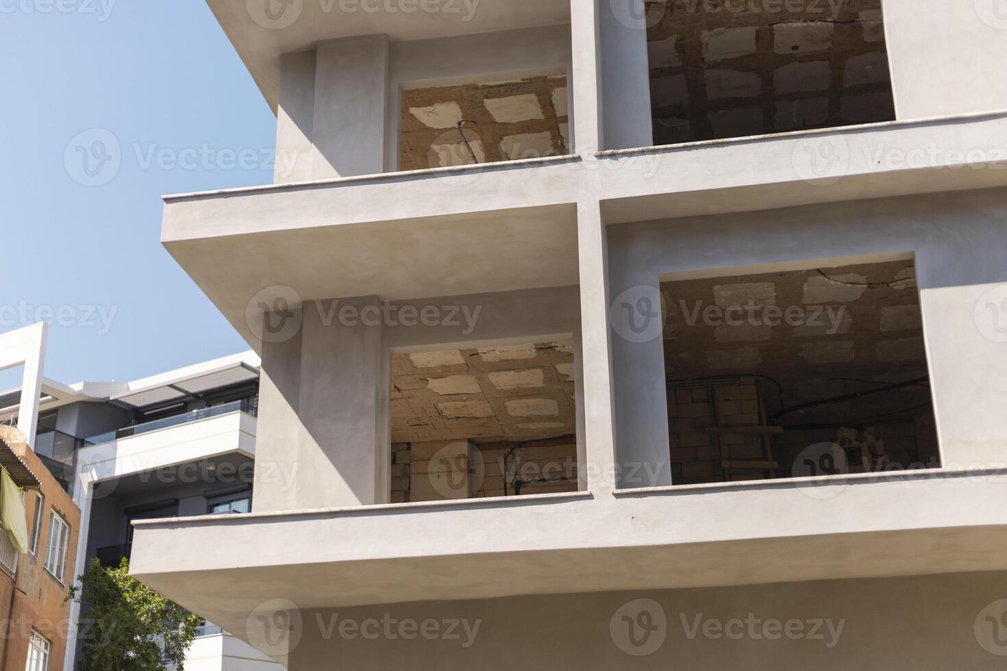 A new building under construction features exposed unfinished sections and empty spaces, revealing structural elements in a vibrant urban environment under a clear blue sky Pro Photo