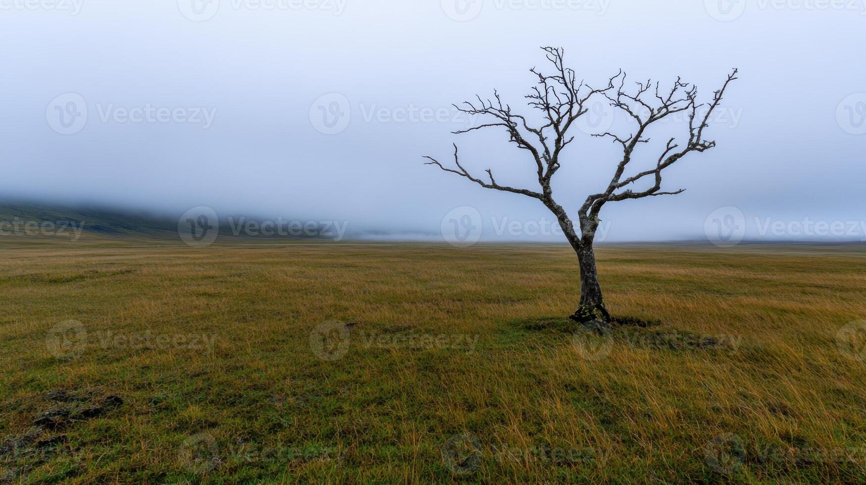A solitary tree with bare branches rises from a vast field during a misty morning. The atmosphere is serene, with low clouds obscuring distant hills, creating an ethereal feel Pro Photo