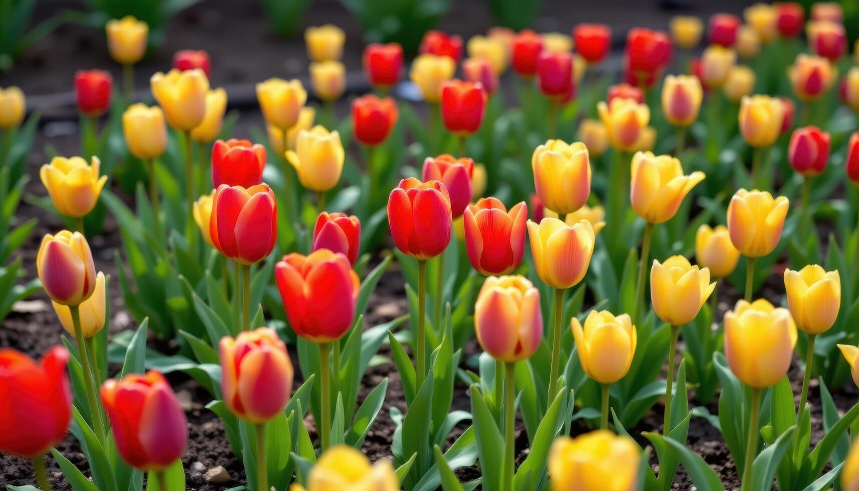 tulips burst open in red and yellow, creating vivid patterns across the garden's soft and fertile soil. photo