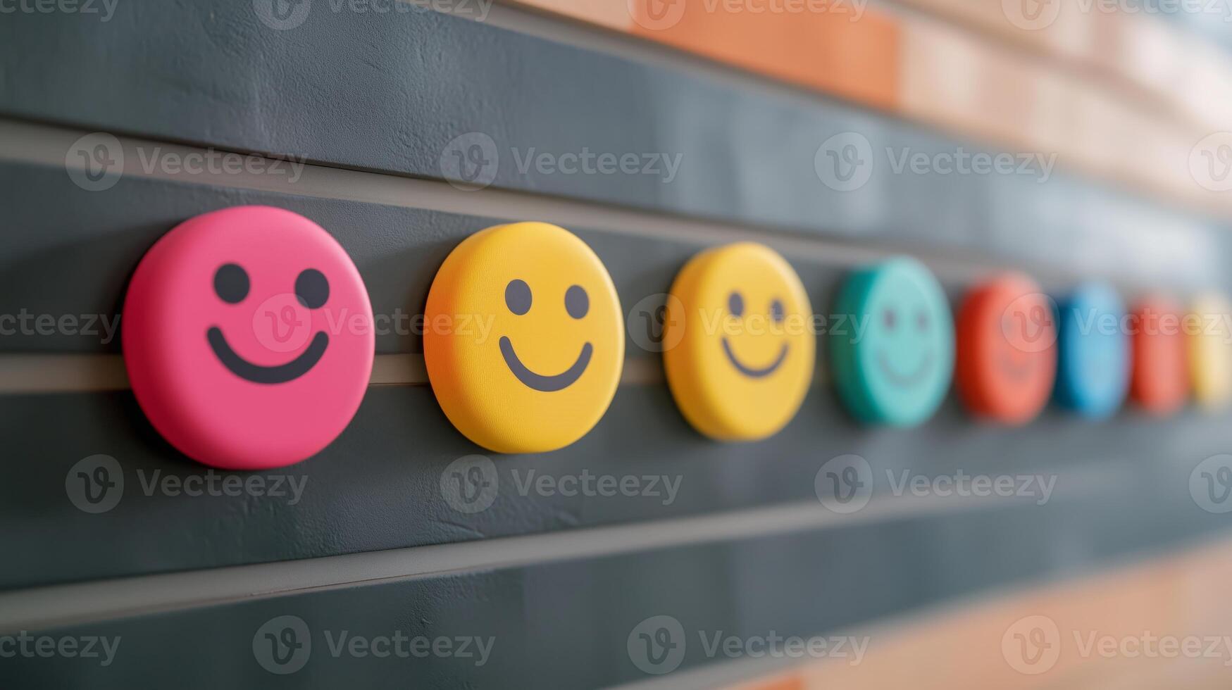 A colorful feedback wall displays various emoji ratings to collect audience reactions in real time. Participants express their feelings using bright, circular buttons at a dynamic event. Pro Photo