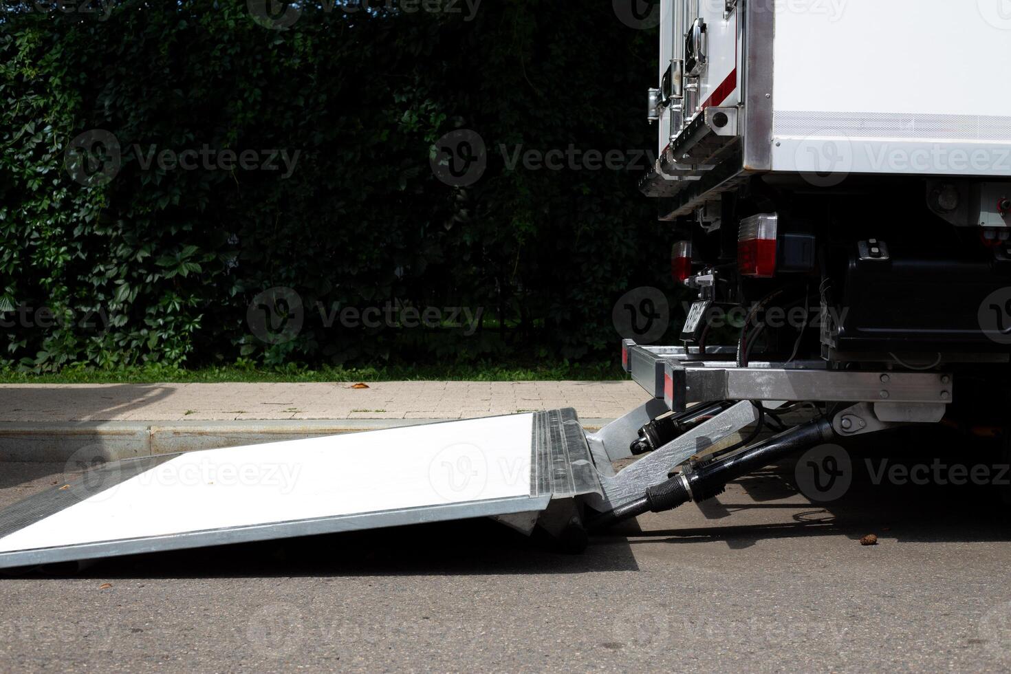 Rear view of delivery truck with hydraulic loading ramp extended onto the street. The ramp is positioned for easy loading and unloading of cargo. The background features greenery and pavement Pro Photo