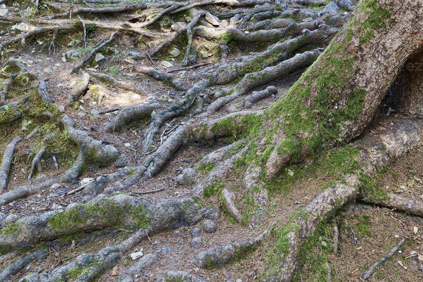 Exposed tree roots covered with moss, sprawling across a forest floor. The intricate network creates a textured natural pattern, showing the resilience of nature in woodland terrain. Pro Photo