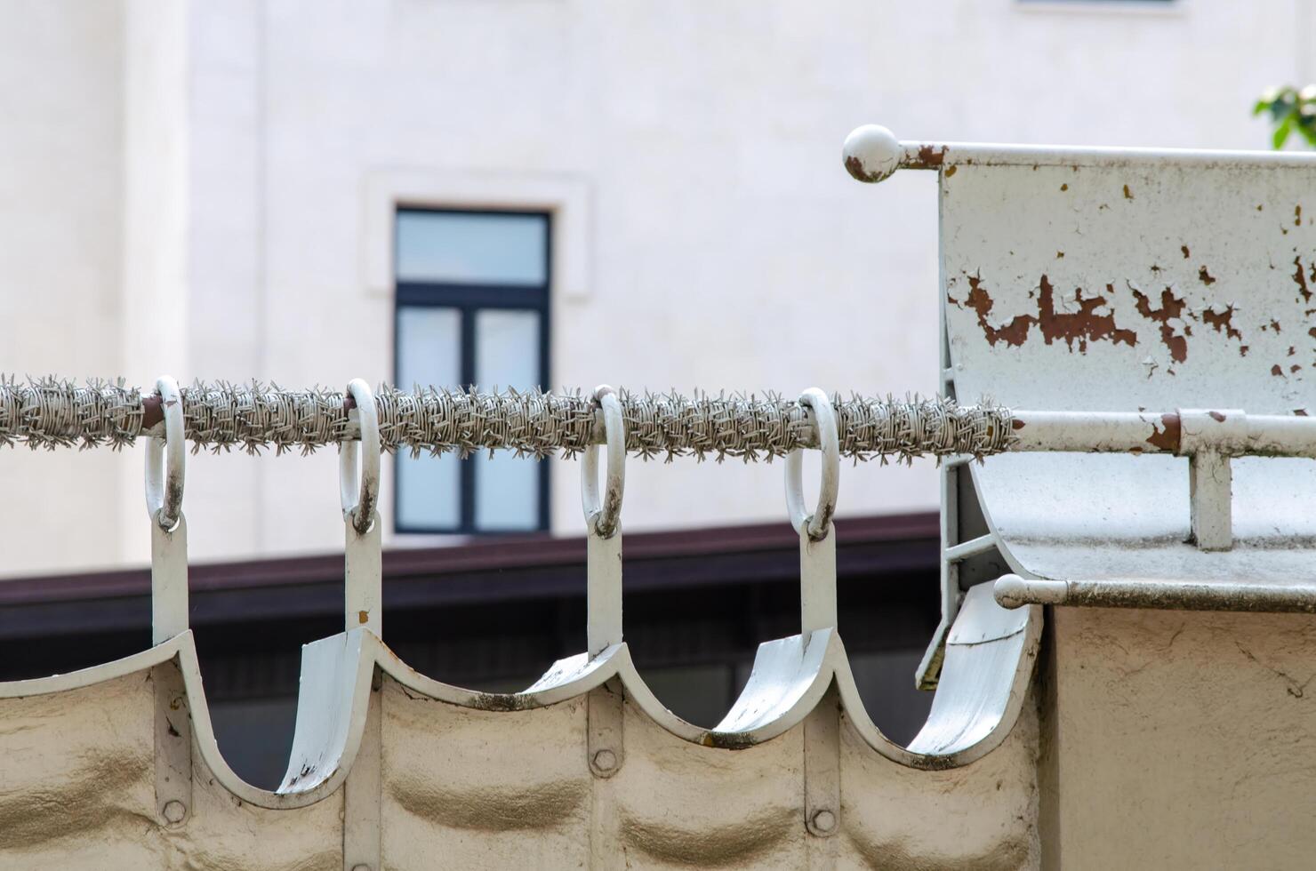 A white fence with a black metal bar on it. The bar is covered in rust and has a foreign language written on it Free Photo
