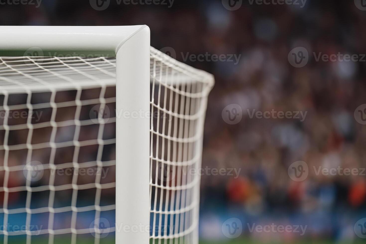 Soccer field goalpost with white netting in football stadium during match with blurred crowd in background creating exciting atmosphere Pro Photo