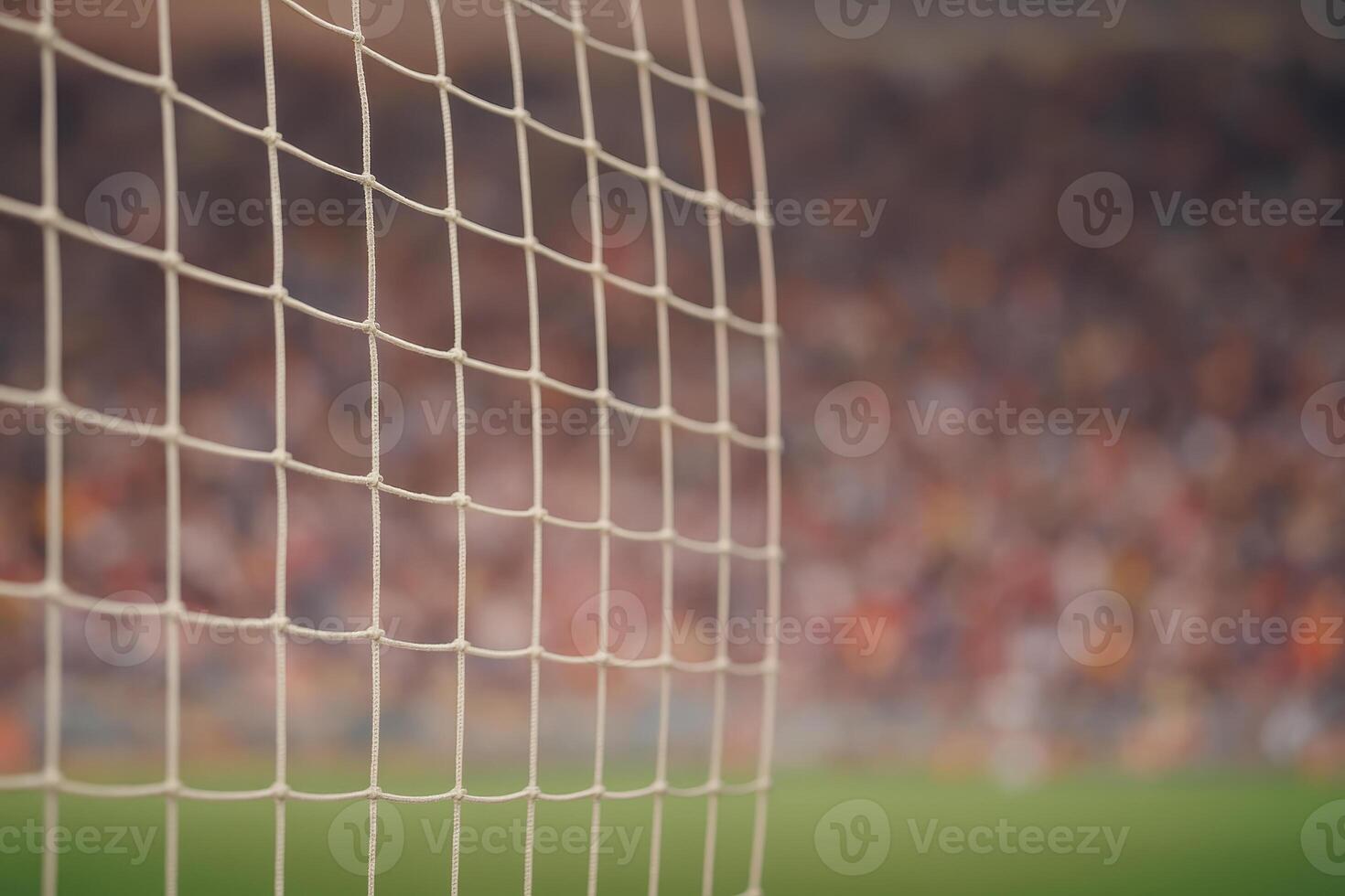 Soccer field goal net close up with blurred football stadium and crowd in background creating exciting sports atmosphere during match Pro Photo