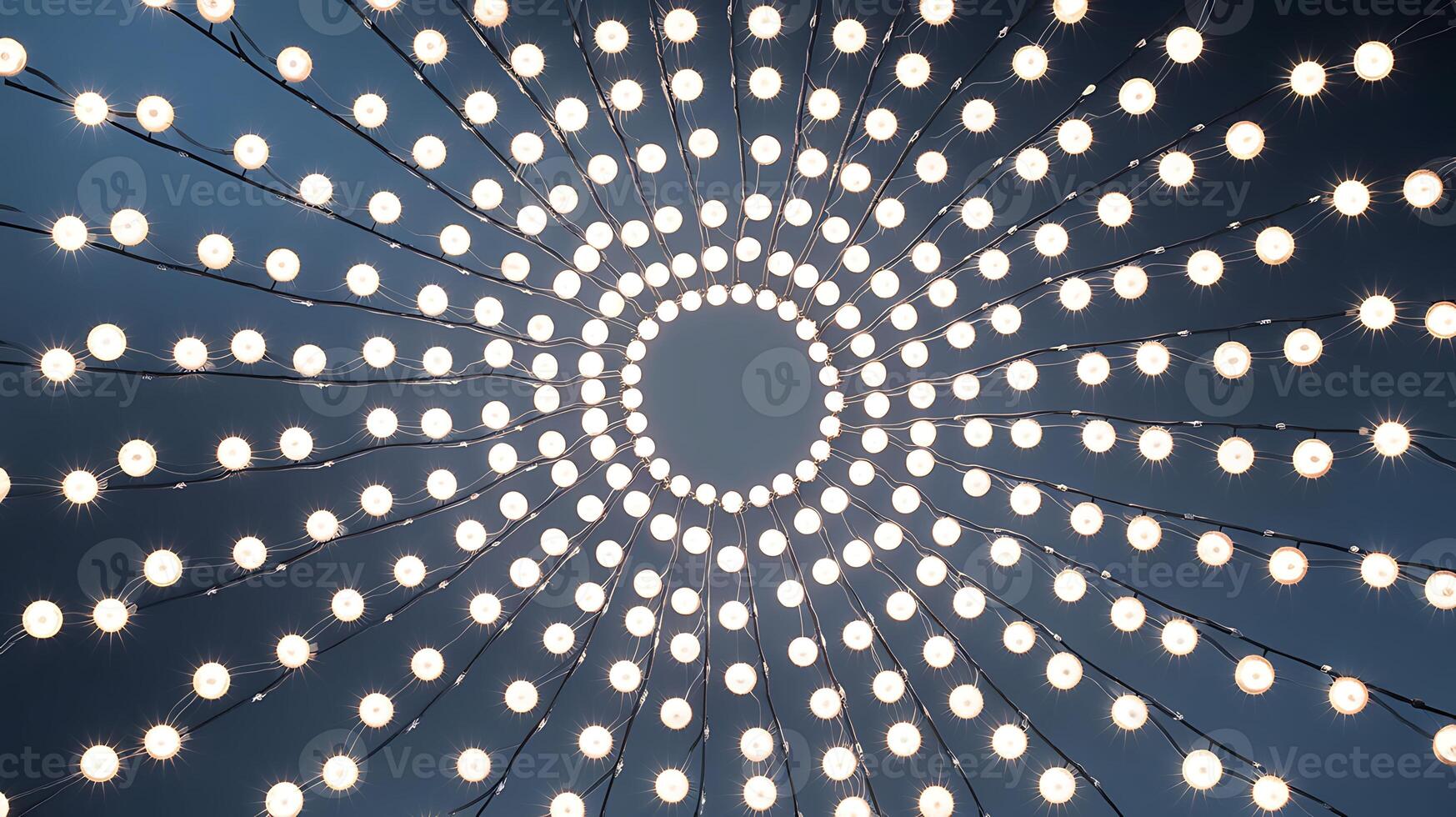 Circular pattern of glowing white string lights against dark blue background abstract bokeh Pro Photo