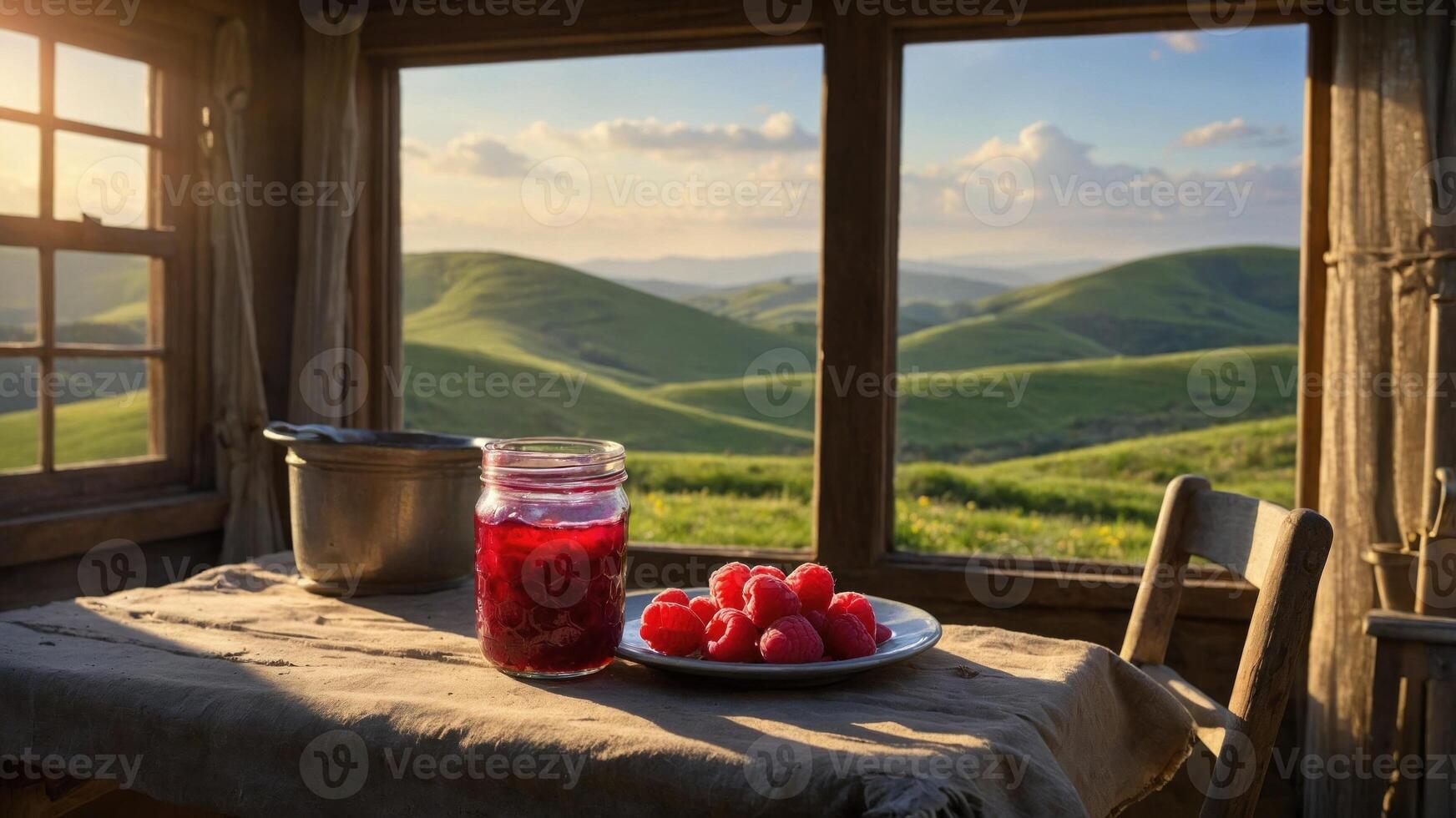 Scenic view from a rustic cabin with a jar of raspberry jam and fresh raspberries on a table Pro Photo