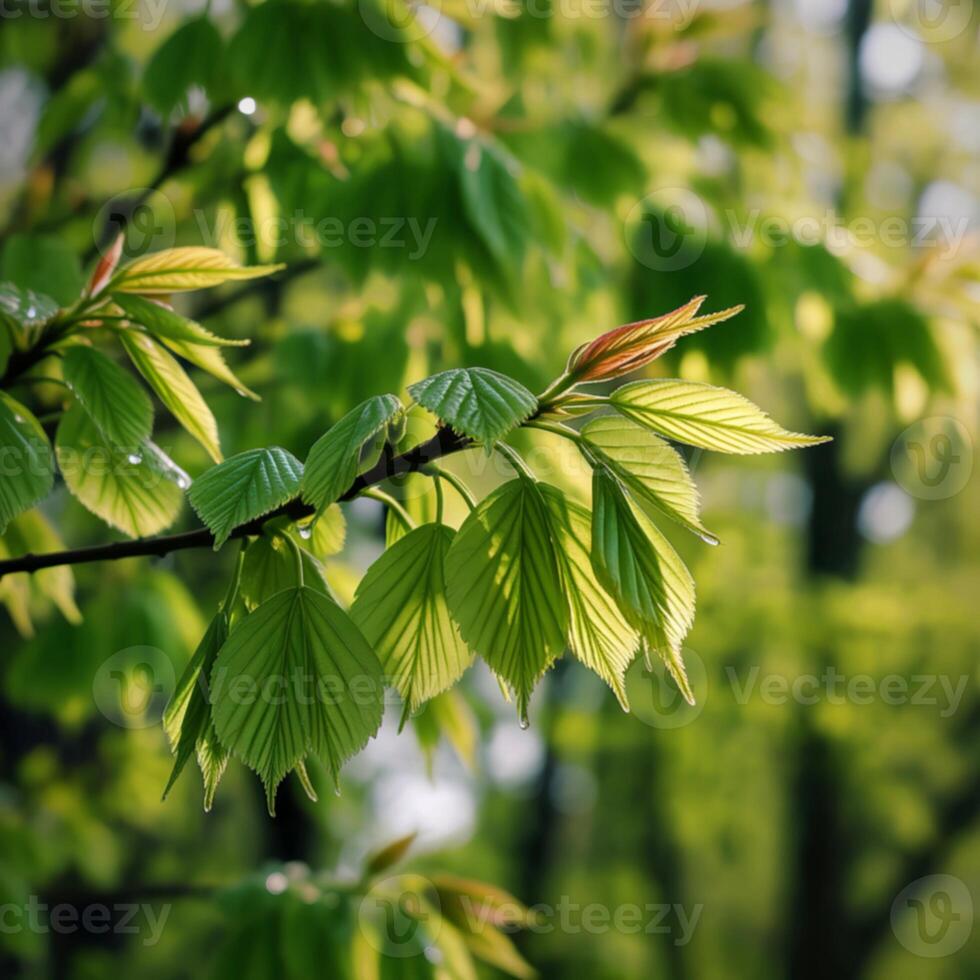 New spring leaves on a tree branch with soft bokeh background Pro Photo