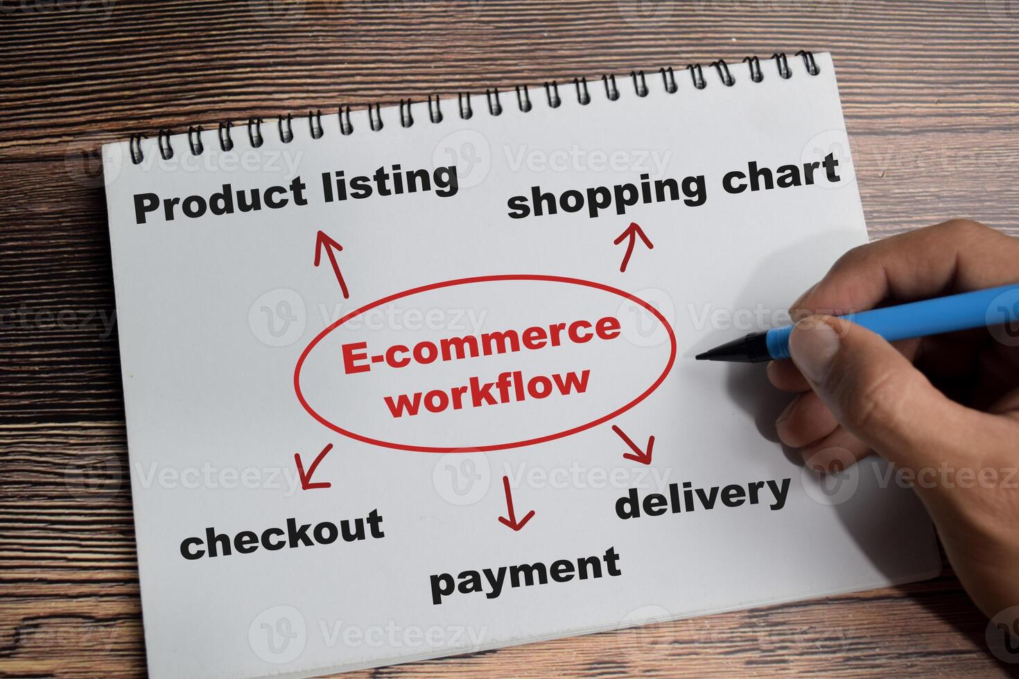 Concept of E-commerce workflow write on book with keywords isolated on Wooden Table. Pro Photo